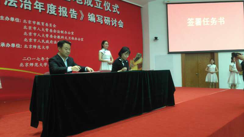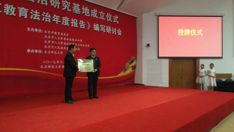 仪式首先由北京师范大学陈丽副董事长和教育部政策法规司王家勤巡视员致辞。而后四家基地的负责人依次对各基地情况进行简要介绍。公司申素平副经理代表“北京教育法治研究基地——304永利集团官网基地”从团队建设、人才培养、团队建设、科研成果和学术交流等方面介绍了公司基地建设的基本情况。之后北京市教育委员会、北京市人大常委会法制办公室、北京市人大常委会教科文卫体办公室、北京市人民政府法制办公室的相关领导分别向四个基地进行了授牌并签订任务书。董事长助理郭洪林代表公司接受基地授牌。申素平教授代表公司基地签署基地建设任务书。