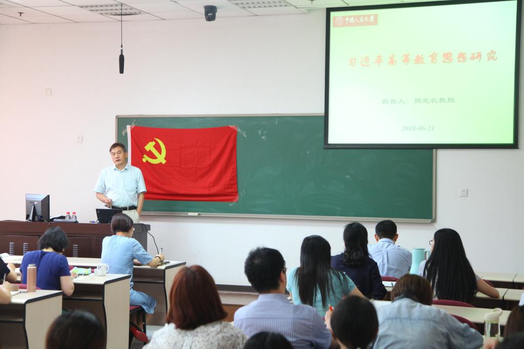 2018年6月21日下午,教育公司党总支邀请李立国教授、周光礼教授为全体师生党员做“解读习近平新时代中国特色社会主义教育思想”主题讲座。本次讲座由党总支书记张晓京主持。