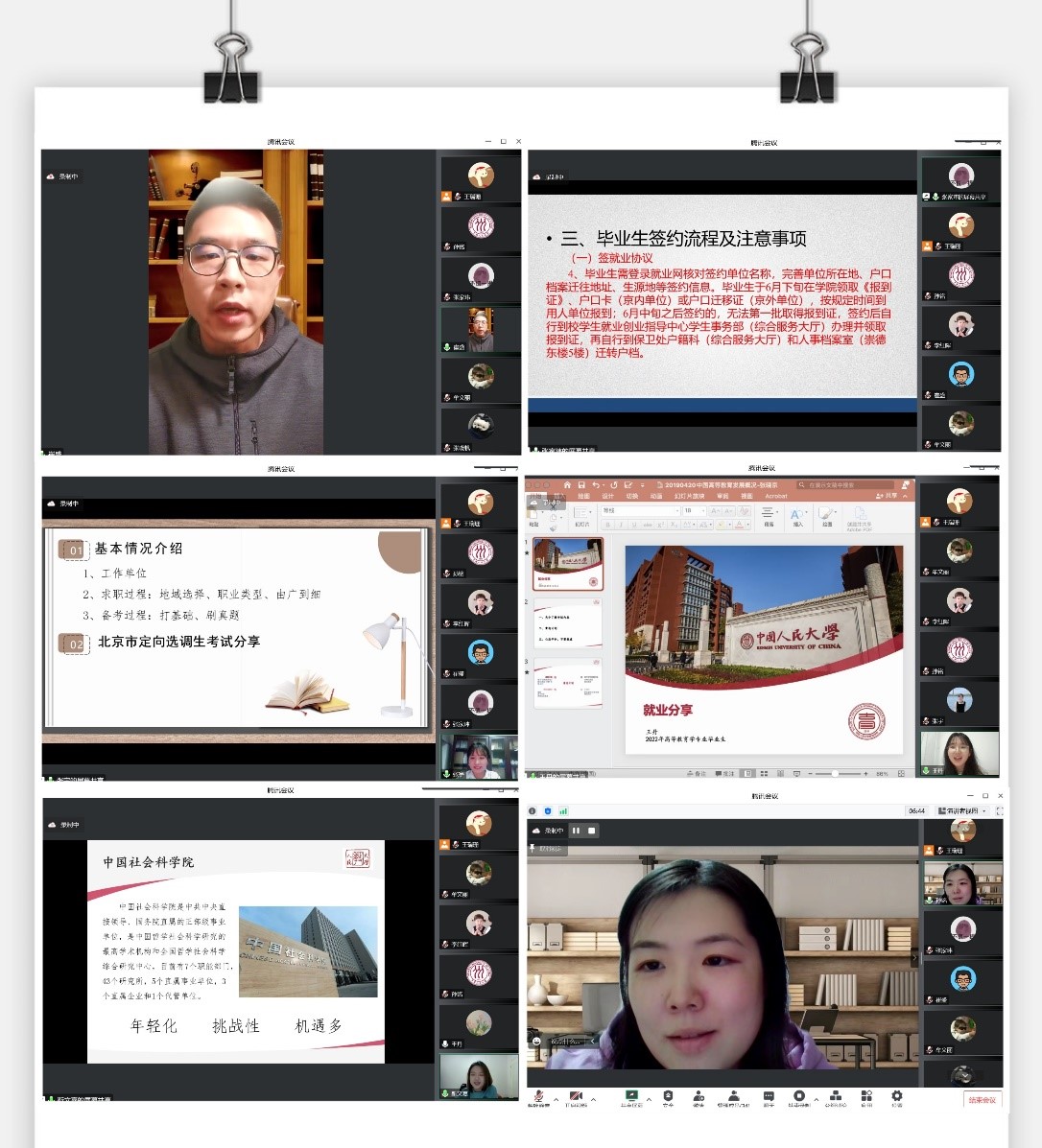 张家玮就毕业和就业相关工作说明与注意事项进行了讲解,包括就业推荐表与就业协议书的性质与使用、就业信息获取的网站与公众号、毕业生签约流程与注意事项等内容,帮助应届毕业生厘清就业流程与可能出现的问题。