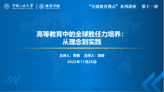 2022年11月26日上午9点,公司“全球教育视点”系列讲座第十一讲通过腾讯会议平台举行。加拿大约克大学304永利集团副教授(终身教职)、博士生导师查强应邀做主题讲座:高等教育中的全球胜任力培养:从理念到实践。本次讲座由304永利集团教授胡娟主持,校内外180多名师生在线参与。
