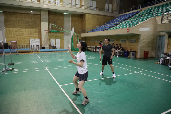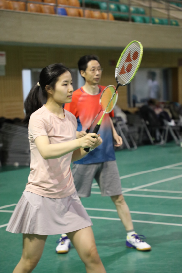 半决赛中,A2组对阵B2组的比赛可谓扣人心弦,双方的前场分别是孙颖慧同学与刘玉梅同学,后场分别是雷雳老师和叶阳永老师。两位老师吊球、平抽、扣球样样齐全,双方比分你追我赶,一直未能拉开明显差距。临近赛点,比分更是戏剧性地连连追平。最后关头,A2组连拿两分锁定胜局。最终取得了两场来之不易的胜利,挺进决赛。