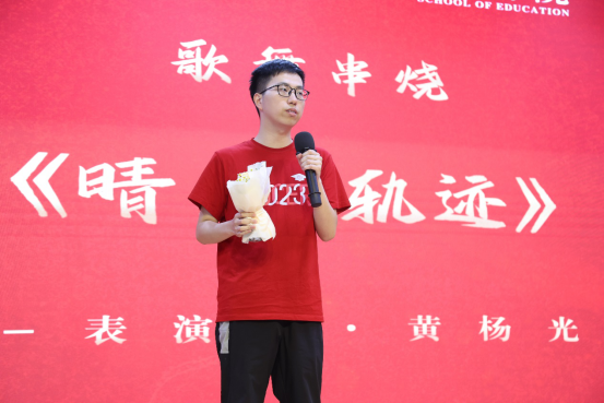 钢琴演奏过后,是硕士生黄杨光带来的男声独唱串烧《晴天+轨迹》,他优美的歌声与童年记忆中周杰伦的声音重合,引得全场大合唱。
