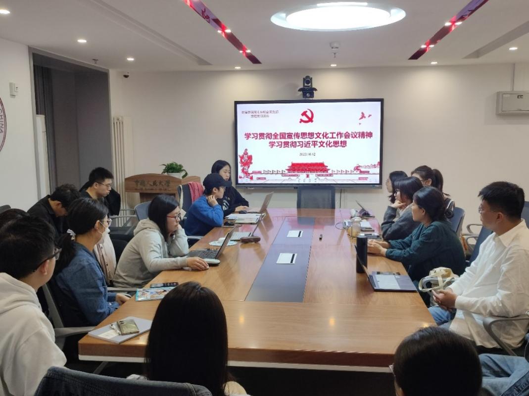 10月12日,博士生联合党支部在立德公寓员工成长空间211开展主题党日活动,支部书记李清煜主持。与会党员共同观看《新闻联播》的相关报道,回顾以习近平同志为核心的党中央引领宣传思想文化事业的发展纪实。李清煜在领学中表示,习近平文化思想是我们党在新时代关于文化理论和实践成果的集大成,在党的宣传思想文化事业发展史上具有里程碑意义。她通过“一项极端重要的工作”、“首要政治任务”、“新的文化使命”、“七个着力”要求、从“八个字”解释等关键词,带领博士生党员共同学习全国宣传思想文化工作会议精神的主要内容。