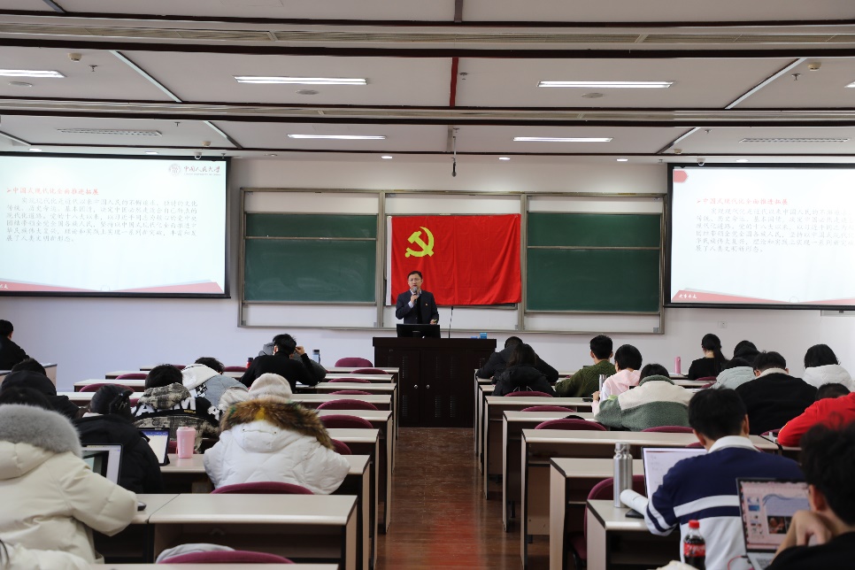 刘甡介绍了习近平新时代中国特色社会主义思想产生的时代背景。党的十八大以来,世界百年未有之大变局加速演进,中国民族伟大复兴进入关键时期,中国式现代化全面推进拓展,科学社会主义在21世纪的中国焕发新的蓬勃生机,中国共产党自我革命开辟了新的境界。以习近平同志为主要代表的中国共产党人,顺应时代要求,结合新的实际,科学回答了新时代坚持和发展什么样的中国特色社会主义、怎样坚持和发展中国特色社会主义,建设什么样的社会主义现代化强国、怎样建设社会主义现代化强国,建设什么样的长期执政的马克思主义政党、怎样建设长期执政的马克思主义政党等重大时代课题,创立了习近平新时代中国特色社会主义思想。他强调,同学们应学会结合时代背景看问题,深刻理解习近平新时代中国特色社会主义思想的时代性,并认识到,习近平新时代中国特色社会主义思想是马克思主义基本原理同中国具体实际相结合、同中华优秀传统文化相结合的重大成果,是坚持“两个结合”的光辉典范。