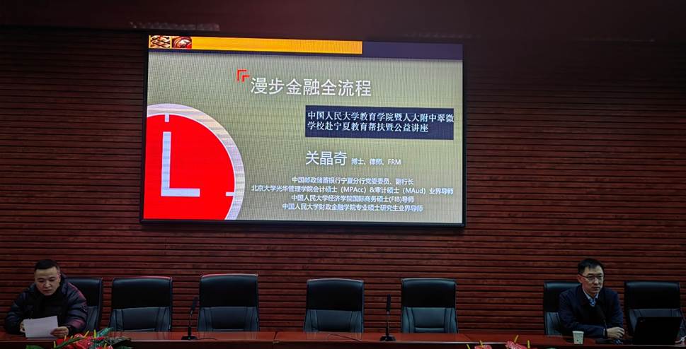 在平罗二中,中国邮政储蓄银行宁夏分行副行长、人大经济公司国际商务硕士导师关晶奇向公司师生作了《漫步金融全流程》讲座,推动金融安全知识进校园,指导员工做好职业生涯规划。