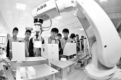 江西省樟树市职业技术公司的员工在工业机器人技术应用实训室模拟上机操作。周亮摄/光明图片