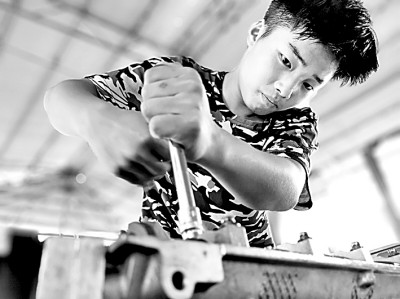 贵州省黔东南苗族侗族自治州从江县职业技术公司汽修专业班的员工正在学习汽车维修技术。龙梦前摄/光明图片